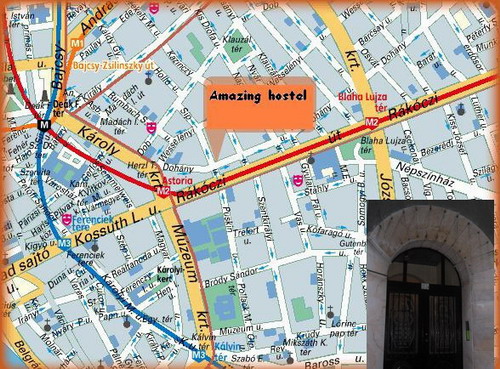 Take the red metro (M2) towards Astoria, then it is only a 2 minutes walk. When you get off the metro, use the right exit, towards Rakoczi ut. Walk along until the first corner (Síp utca), turn left and cross Dohány utca, then turn right and after a few meters the hostel will be on your left-hand side: Dohány utca #22-24.